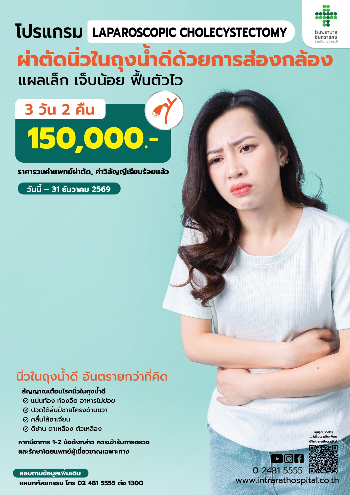 - แต่อย่างไรก็ตามในการผ่าตัดนิ่วในถุงน้ำดีด้วยการเจาะส่องผ่านกล้อง จะสามารถเข้าในแพคเก็จหรือไม่นั้นขึ้นอยู่กับดุลยพินิจของศัลยแพทย์เจ้าของไข้เท่านั้นซึ่งแพคเก็จนี้จะไม่ครอบคลุมภาวะแทรกซ้อนหรือการผ่าตัดบางชนิด อาทิ โรคถุงน้ำดีอักเสบแบบเฉียบพลัน การผ่าตัดเพื่อเลาะพังผืด การผ่าตัดนิ่วในถุงน้ำดีแบบเปิดหน้าท้อง มีการใส่สาย Drain เพื่อระบายของเสีย มีการติดเชื้อรุนแรงเป็นต้น